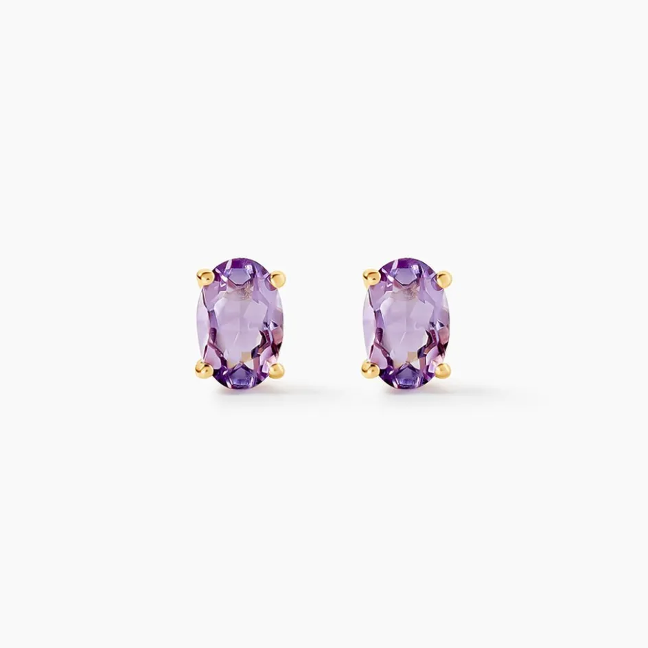 Boucles D’oreilles Or Jaune 375/1000 Améthyste Ovale Serti 4 Griffes 6x4mm