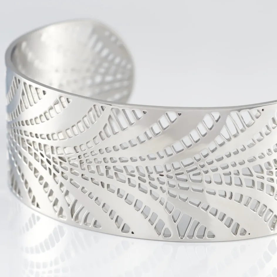 Bracelet Manchette Acier Blanc Ouvert Ajoure Motif Vegetal Diamètre 59*48mm Largeur 25mm