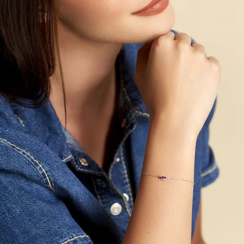 Bracelet Or Jaune 375/1000 Trilogie Rubis Et Diamants Rondes Sertis Griffes Et Micro Serti Maille Forcat 16+2cm