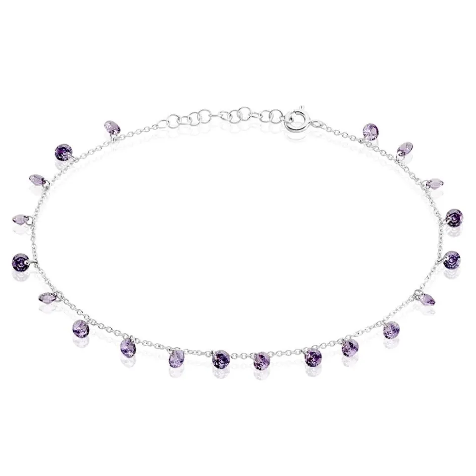 Chaîne De Cheville Argent Blanc 925/1000 Pampilles Oxydes De Zirconium Violets Maille Forçat 25cm