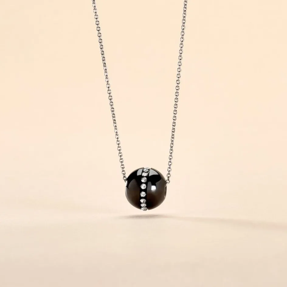 Collier Argent Blanc 925/1000 Pendentif Boules Ceramique Lisse Noire Pierres Blanches Maille Forcat 45cm