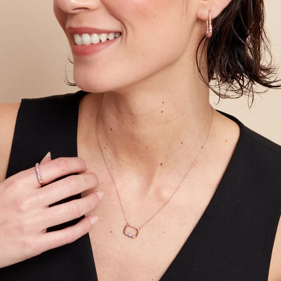 Collier Argent Rose 925/1000 Rectangle Pavage Pierres Multicolores Maille Forcat 43+2cm