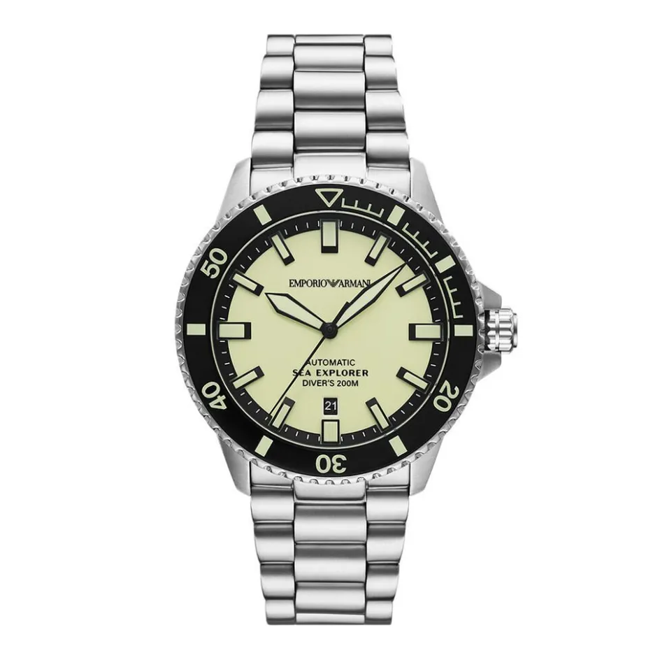 Montre Armani Sea Explorer Acier Argente Ronde Auto 42.5mm Fond Jaune Lunette Tournante Noir Bracelet Acier Argente Ar60083