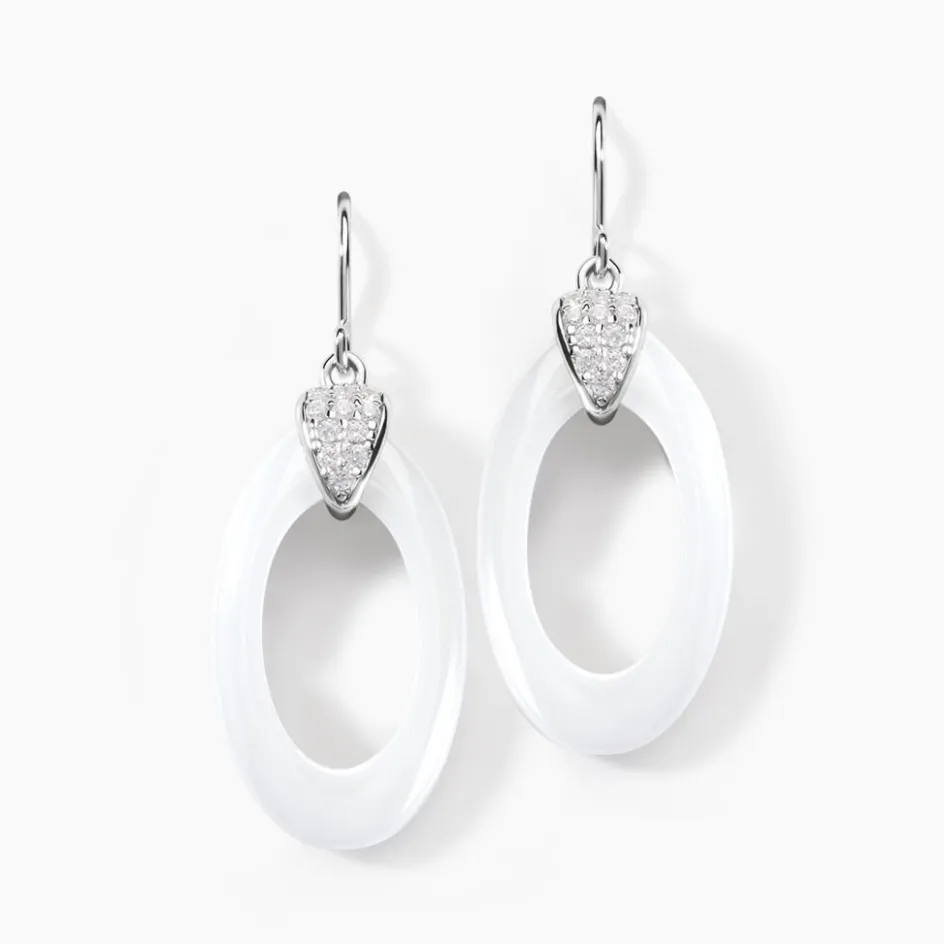 Boucles D’oreilles Pendantes Argent Blanc 925/1000 Ceramiques Blanches Ovales Pavage Oxydes De Zirconium