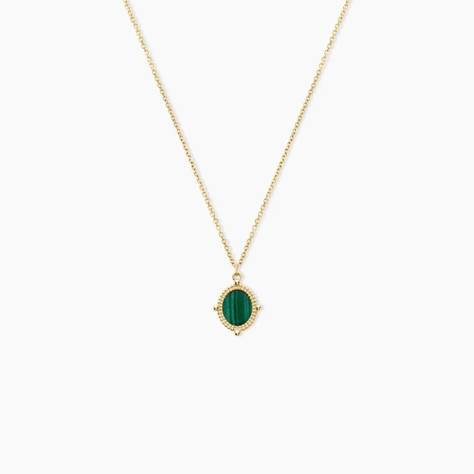 Collier Or Jaune 375/1000 Malachite Ovale Effet Perle Maille Jaseron 40+2cm