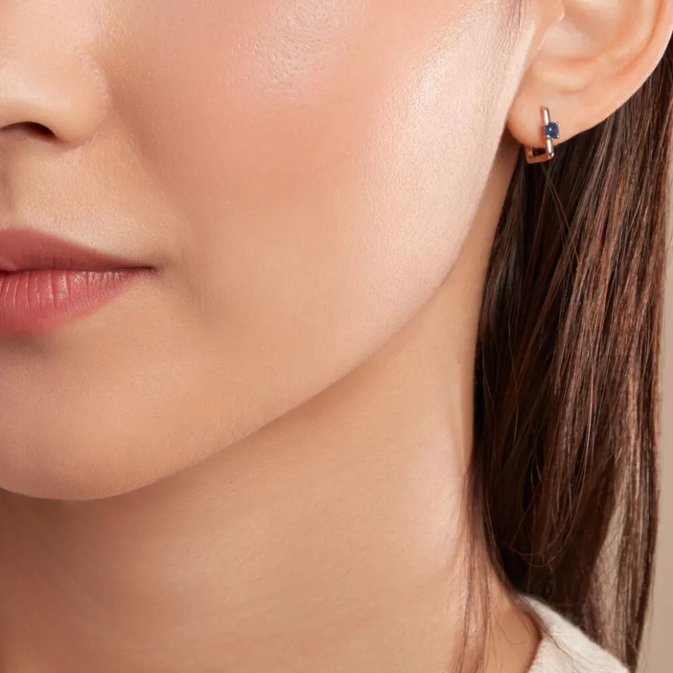 Creoles Or Jaune 375/1000 Carre Avec 1 Saphir Ronde 0.3cts Serti Griffes