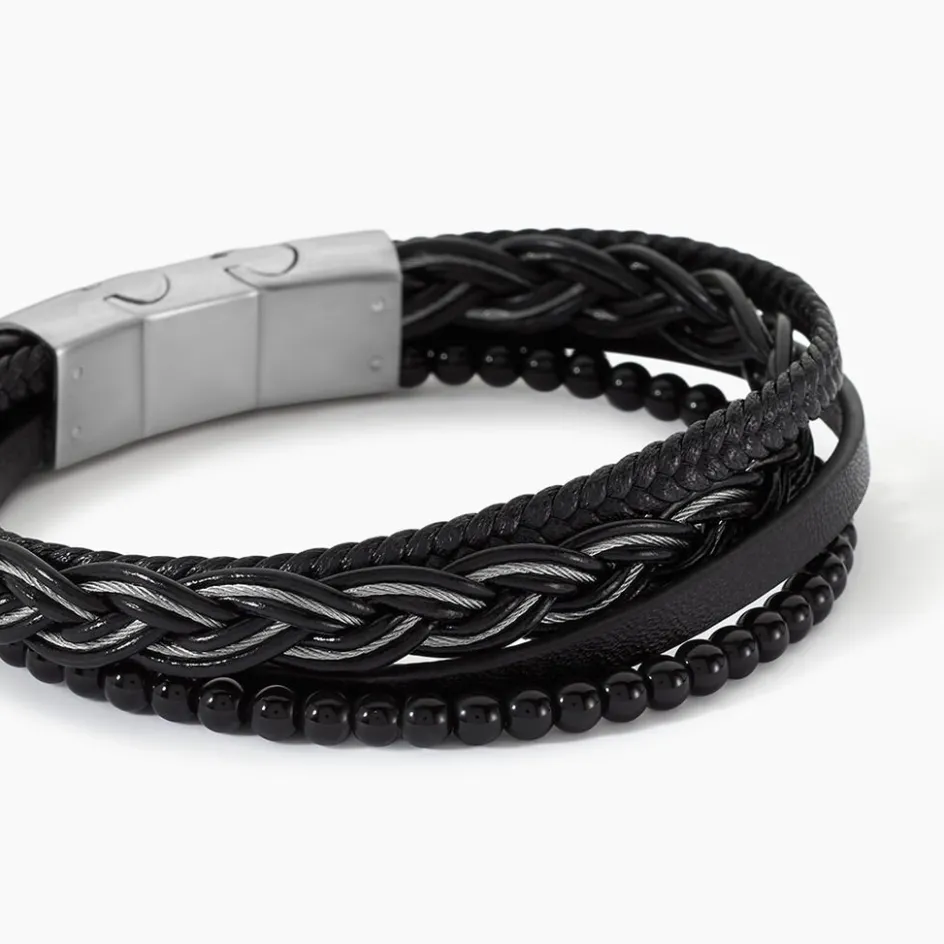 Bracelet Jourdan Tex Multi Rang Cuir Noir Acier Noir Boules Onyx Noir 21cm Jh250066b