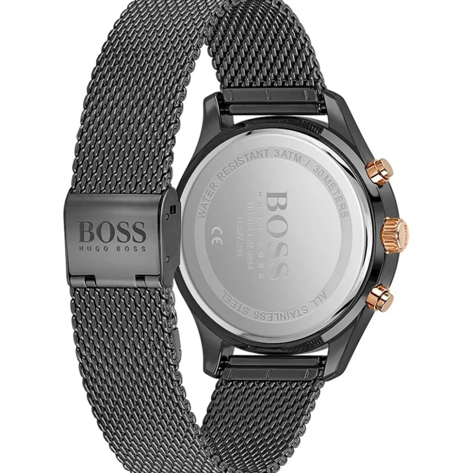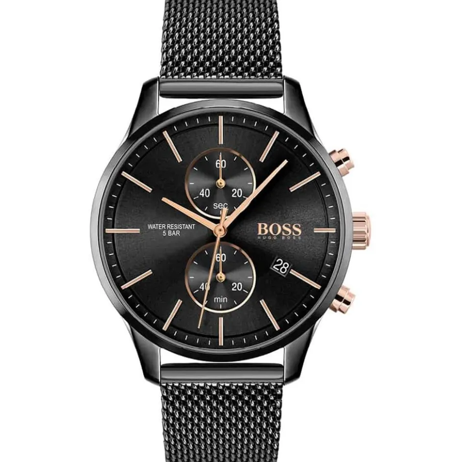 Montre Boss Associate Acier Noir Ronde Chronographe 42mm Fond Noir Bracelet Acier Maille Milanaise Noir 1513811