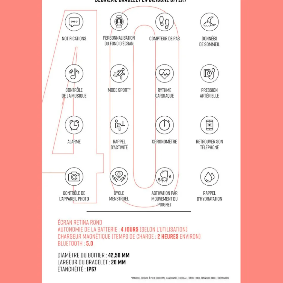 - Suivi d’activité Analyse du sommeil,Calories dépensées,Durée parcours,Podomètre,Suivi activité