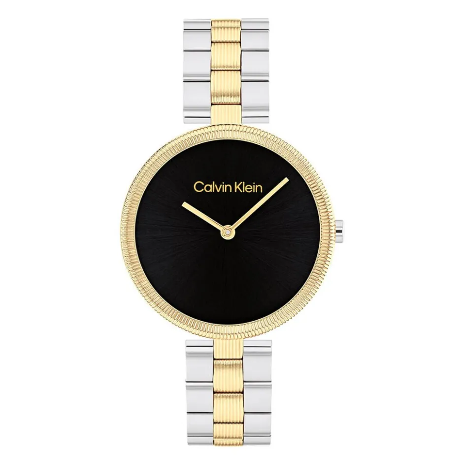 Montre Calvin Klein Gleam Acier Dore Rond Quartz 32mm Fond Noir Bracelet Acier Bicolore Dore Blanc Maillons 25100012