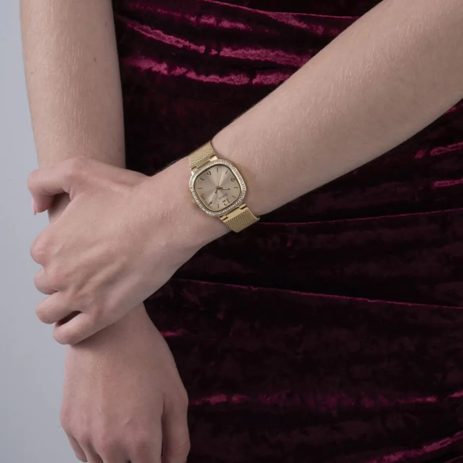 Montre Guess Tapestry Acier Doré Carrée Quartz 32mm Fond Doré Lunette Strass Bracelet Acier Maille Milanaise Doré Gw0354l2