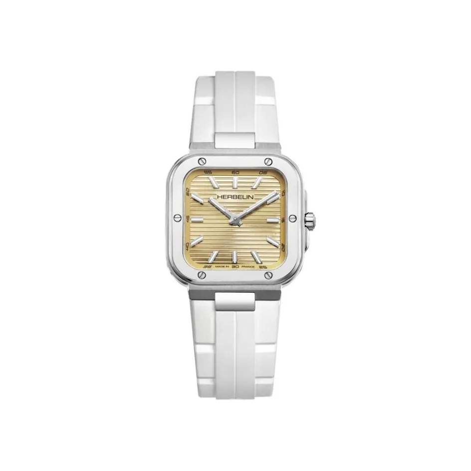 Montre Herbelin Cap Camarat Acier Inoxydable Argenté Quartz Carre 30Mm Fond Champagne Bracelet Silicone Blanc 17546A13Cw