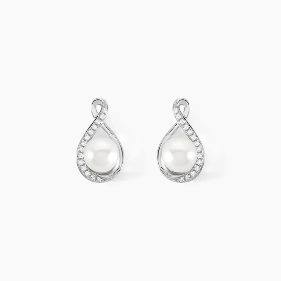Boucles D’oreilles Puces Or Blanc 375/1000 Formes Gouttes Perles De Culture 5.5-6mm Et Oxydes De Zirconium
