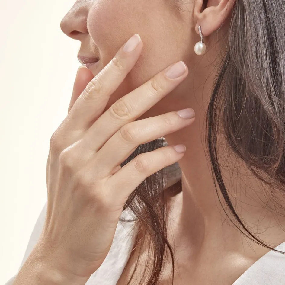 Boucles D’oreilles Pendantes Argent Blanc 925/1000 Perles De Culture Blanches 8/8.5mm Oxydes De Zirconium