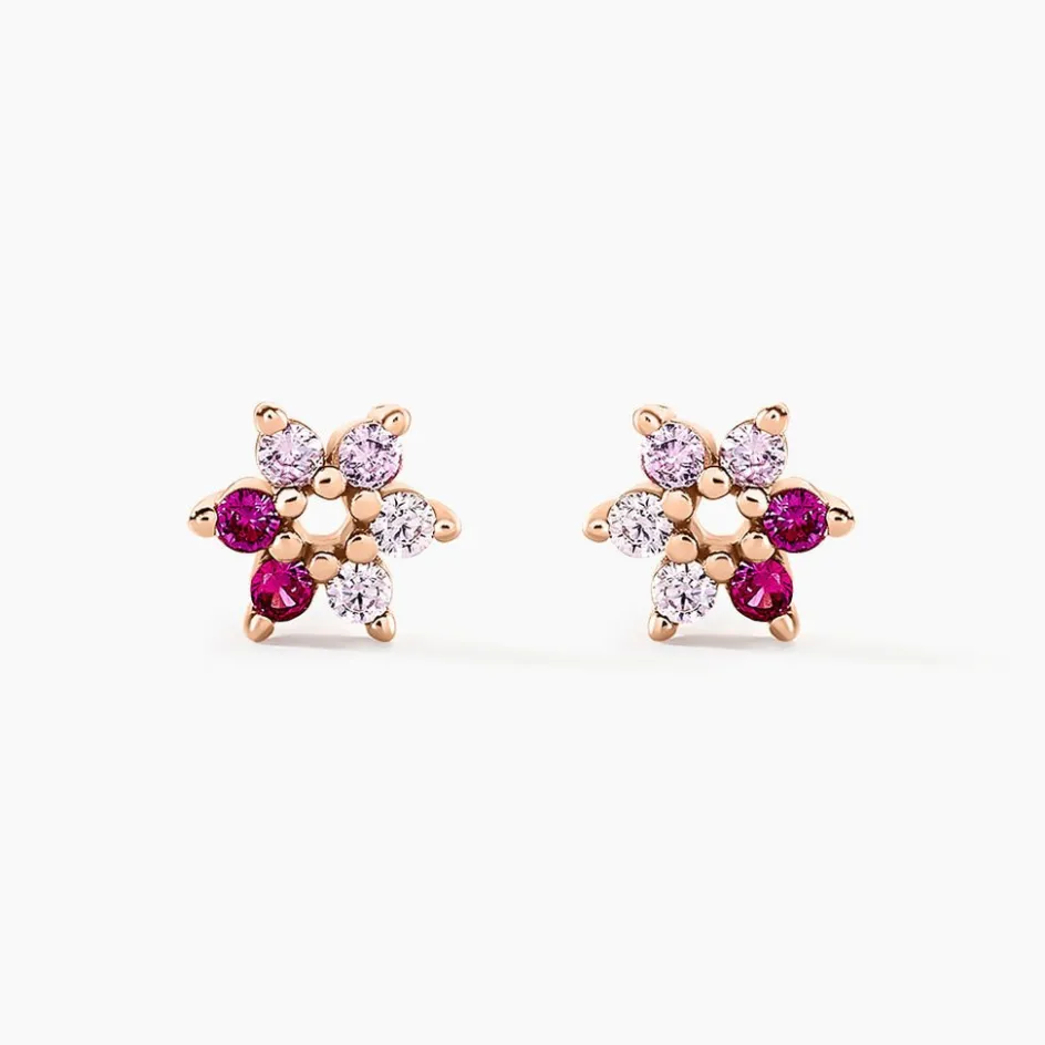 Boucles D’oreilles Puces Argent Rose 925/1000 Fleurs Camaieu Rose Serti Griffes Oxydes De Zirconium