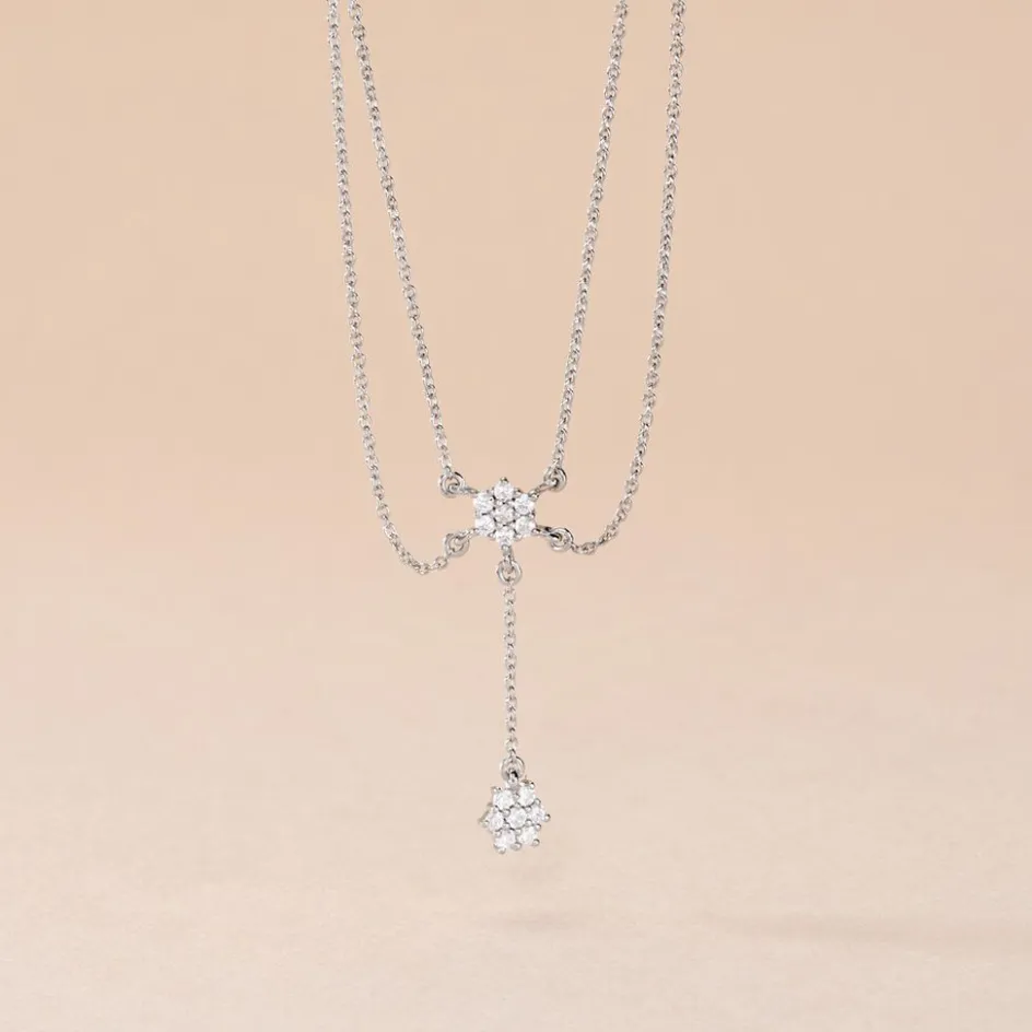Collier Argent Blanc 925/1000 Double Rang Fleurs Oxydes De Zirconium Serti 4 Griffes Maille Forcat 38+2cm