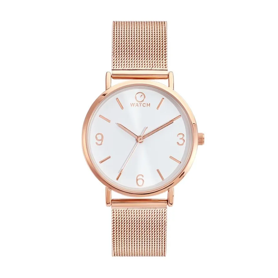 Montre O Watch Smart Alliage Rose Ronde Quartz 33mm Fond Blanc Bracelet Maille Milanaise Acier Rose P100881-ao