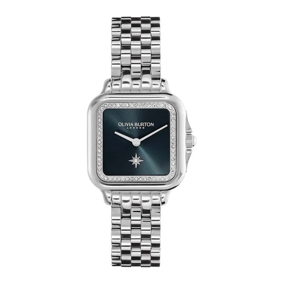 Montre Olivia Burton Grosvenor Acier Blanc Carrée Quartz 28mm Fond Bleu Entourage Strass Bracelet Acier Blanc 24000083