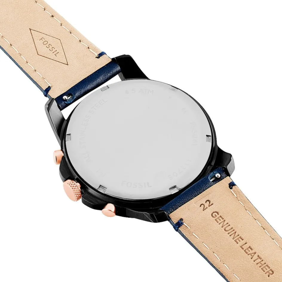 Montre Fossil Grant Acier Noir Ronde Quartz Chronographe 44mm Fond Noir Bracelet Cuir Bleu Fs5061