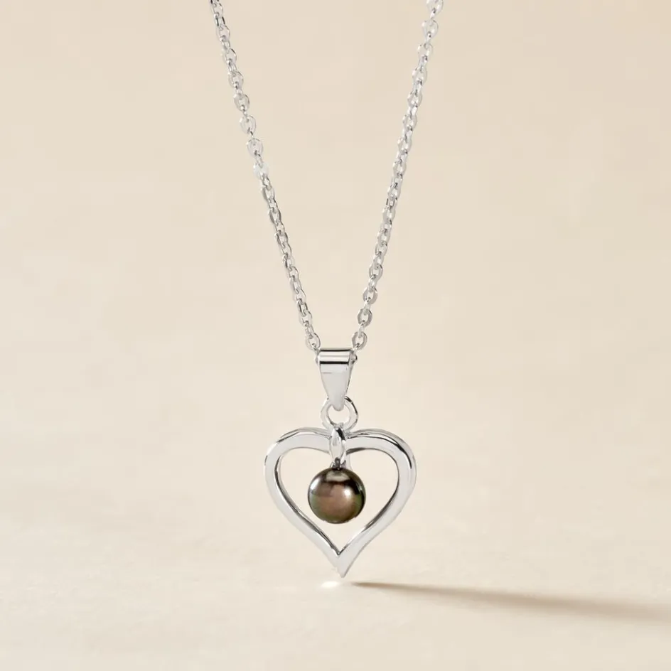 Collier Forcat Argent Blanc 925/1000 Pendentif Coeur Et Perle De Culture Grise 6/6.5mm