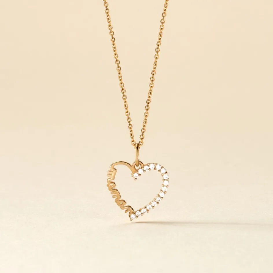 Pendentif Or Jaune 375/1000 C艙ur Message Maman Oxyde De Zirconium Ronde Serti Griffes