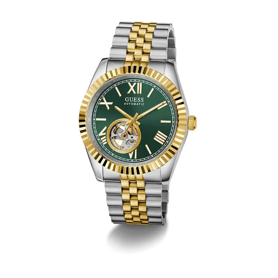 Montre Guess Connoisseur Acier Inoxydable Bicolore Dore/Blanc Automatique Ronde 42Mm Fond Vert Coeur Ouvert Bracelet Acier Inoxydable Bicolore Dore/Blanc Gw0984G4
