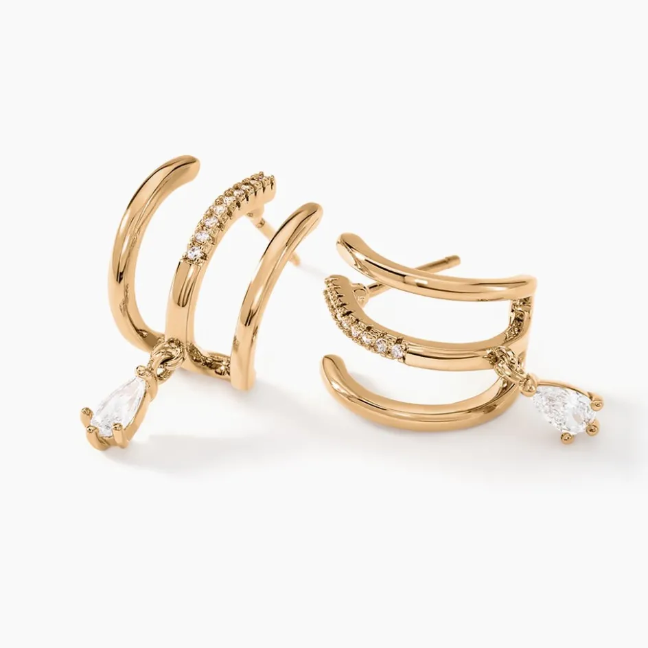 Boucles D’oreilles Plaqué Or Jaune Triple Rangs Pampilles Gouttes Oxydes De Zirconium