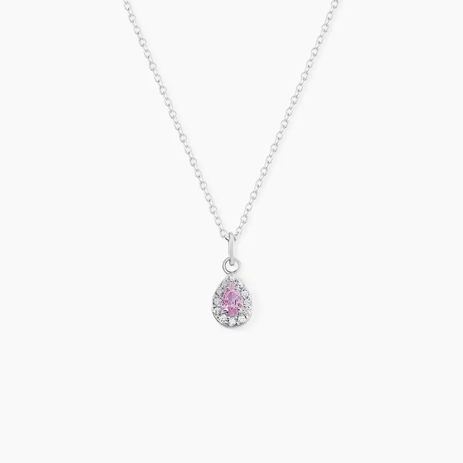 Collier Court Argent Blanc 925/1000 Goutte Rose Entourage Oxyde De Zirconium Maille Forcat Serti Griffes Pm 38cm