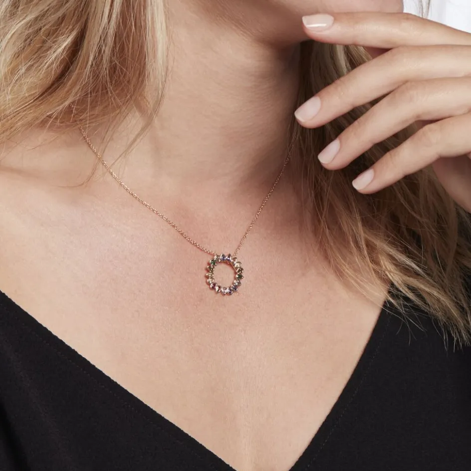 Collier Plaque Or Jaune Forme Cercle Ajoure Pierres Multicilores 44cm