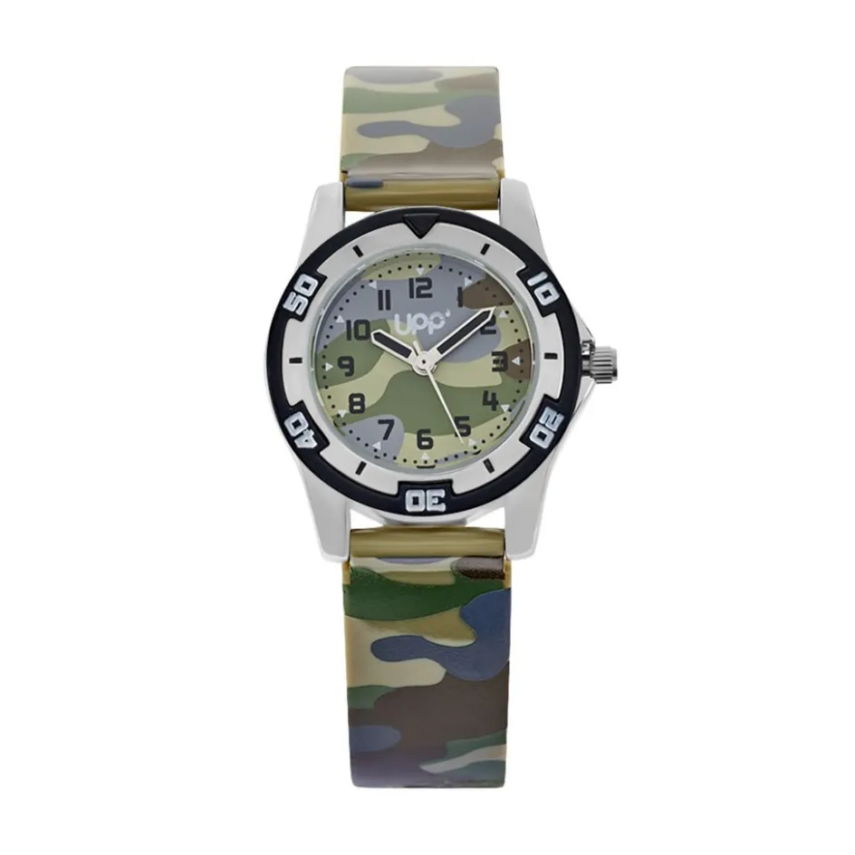 Montre Upp Alexis Alliage Argenté Ronde Quartz 28.75mm Lunette Noire Fond Camouflage Bracelet Plastique Camouflage Cl241