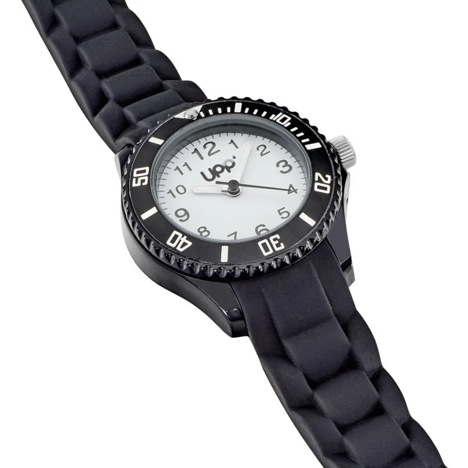 Montre Upp Aria Plastique Noir Ronde Quartz 29mm Lunette Tournante Noire Fond Blanc Bracelet Silicone Noir Cl246